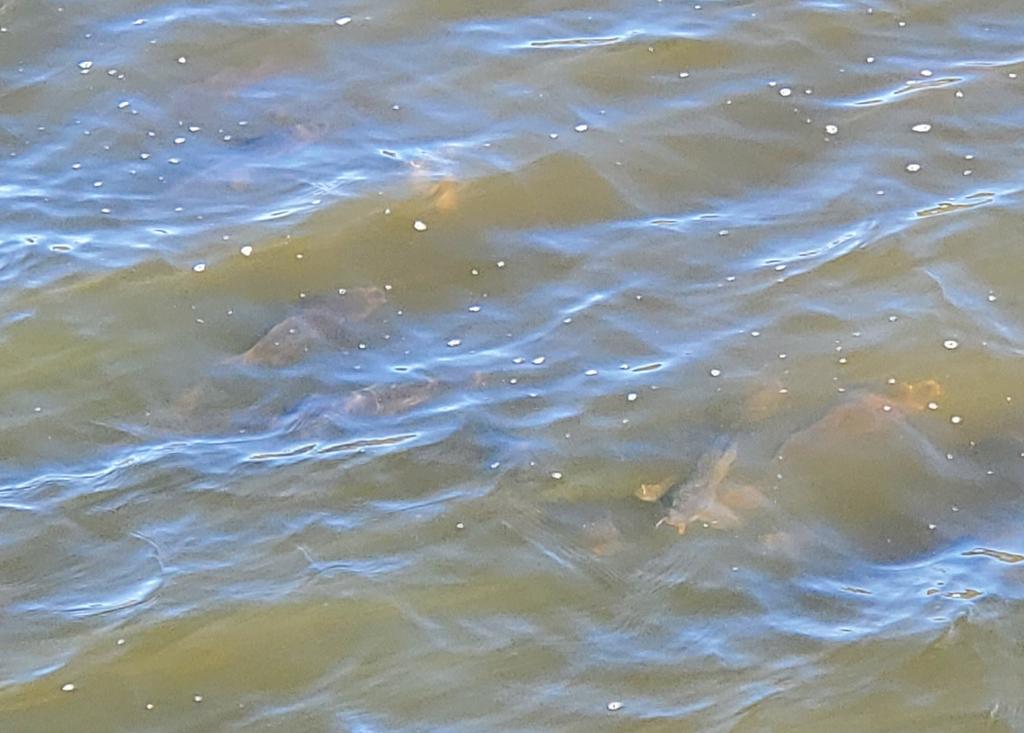 I proceeded down the boardwalk another 50 feet and see another group of carp even closer. I picked the one closest to me and shot. Another thud and see what looked like three or four fish on the arrow.