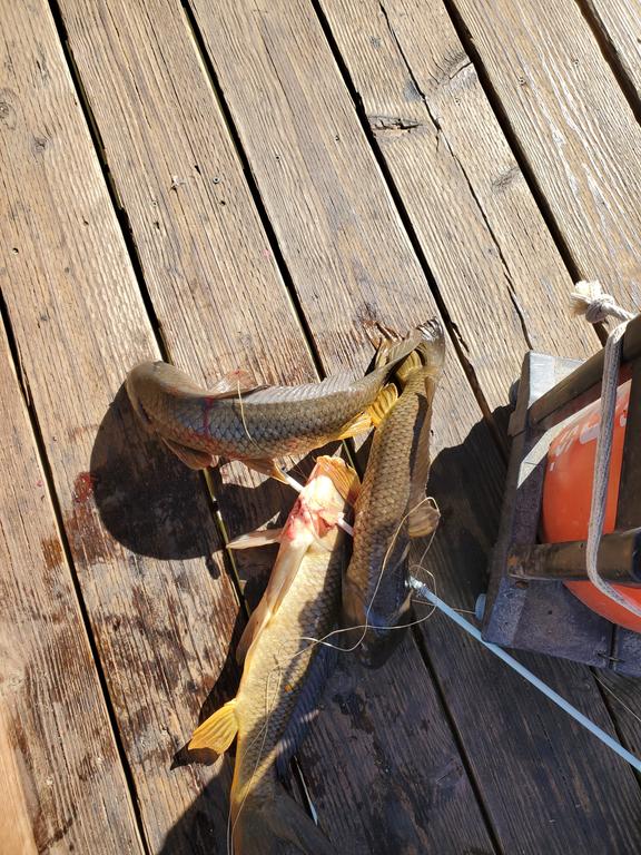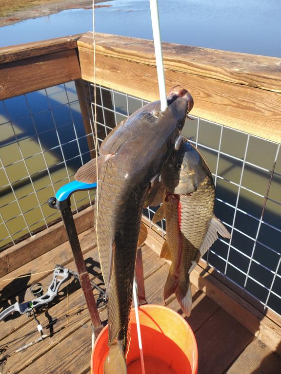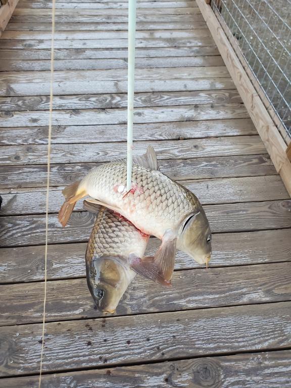I walk out and find another group of carp (as tightly packed as the last one) 10 feet from the boardwalk. Took the shot, got another nice thud, and pulled in another double.
